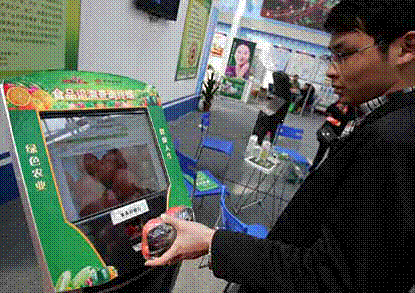 第十六届西洽会安徽展区内,一名工做人员将贴有指定标签包拆好的蔬菜正在“食物逃溯查询终端”系统上一扫,屏幕上当即显示出蔬菜的名称、编号、农药残留检测成果和发卖地址等多种消息。图/CFP。